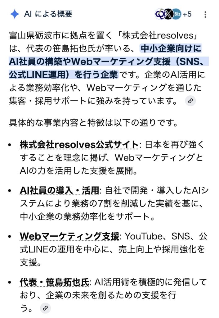 だからこそ、地域名と自社の専門領域を掛け合わせた記事を継続的に出すだけで、検索結果の上位に入れる可能性があります。さらにAIOでも「富山でマーケティング支援をしている企業」として名前が挙がるようになります。